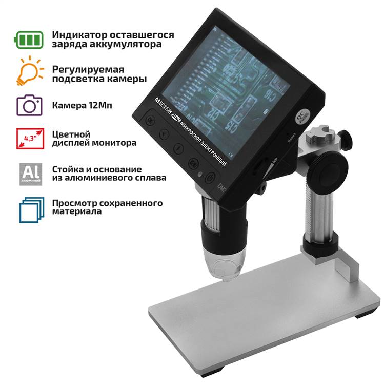 МЕГЕОН 33102 - новинка в модельном ряду цифровых микроскопов. Модель сочетает в себе: эргономичную форму, небольшие размеры, вес и высокие эксплуатационные характеристики. Стойка и основание изготовлены из алюминиевого сплава. Прибор оборудован аналоговой камерой 12 Мп, которая позволяет делать снимки и записывать видео в высоком разрешении. Регулируемая подсветка включает в себя 8 ярких светодиодов с увеличенным ресурсом. Цветной монитор с дисплеем 4,3’ отобразит мельчайшие объекты, которые неразличимы невооружённым взглядом. Изделие имеет простой и понятный интерфейс, переведённый на 12 языков, большое количество опций изображения и плавную настройку фокуса. С целью сохранения заряда аккумуляторной батареи предусмотрена функция автоматического выключения и затухания экрана. Прибор найдёт широкое применение в исследованиях, контроле качества на производстве, ювелирном деле, ремонте печатных плат и различной радиоэлектронной аппаратуры.