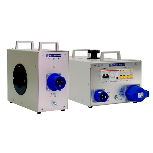 Регулятор напряжения ЛАТР-ИТ5000 подключается к сети переменного тока 220 В. Розетка «Выход» ЛАТР-ИТ5000 соединяется с вилкой «Вход» НТ-ИТ3000 кабелем «ЛАТР-НТ». Кабели «К-240», «К-120», «К-50», «К-16» используют в качестве внешней обмотки (контура тока). Их пропускают через отверстие на блоке НТ-ИТ3000 и подключают к первичным обмоткам измерительных ТТ. При работе на номинальных первичных токах 250, 200 и 150 А для поверки одно- и пятипроцентных значений тока измерительных ТТ между блоками ЛАТР-ИТ5000 и НТ-ИТ3000 необходимо включать Блок резисторов НТ-ИТ5000.